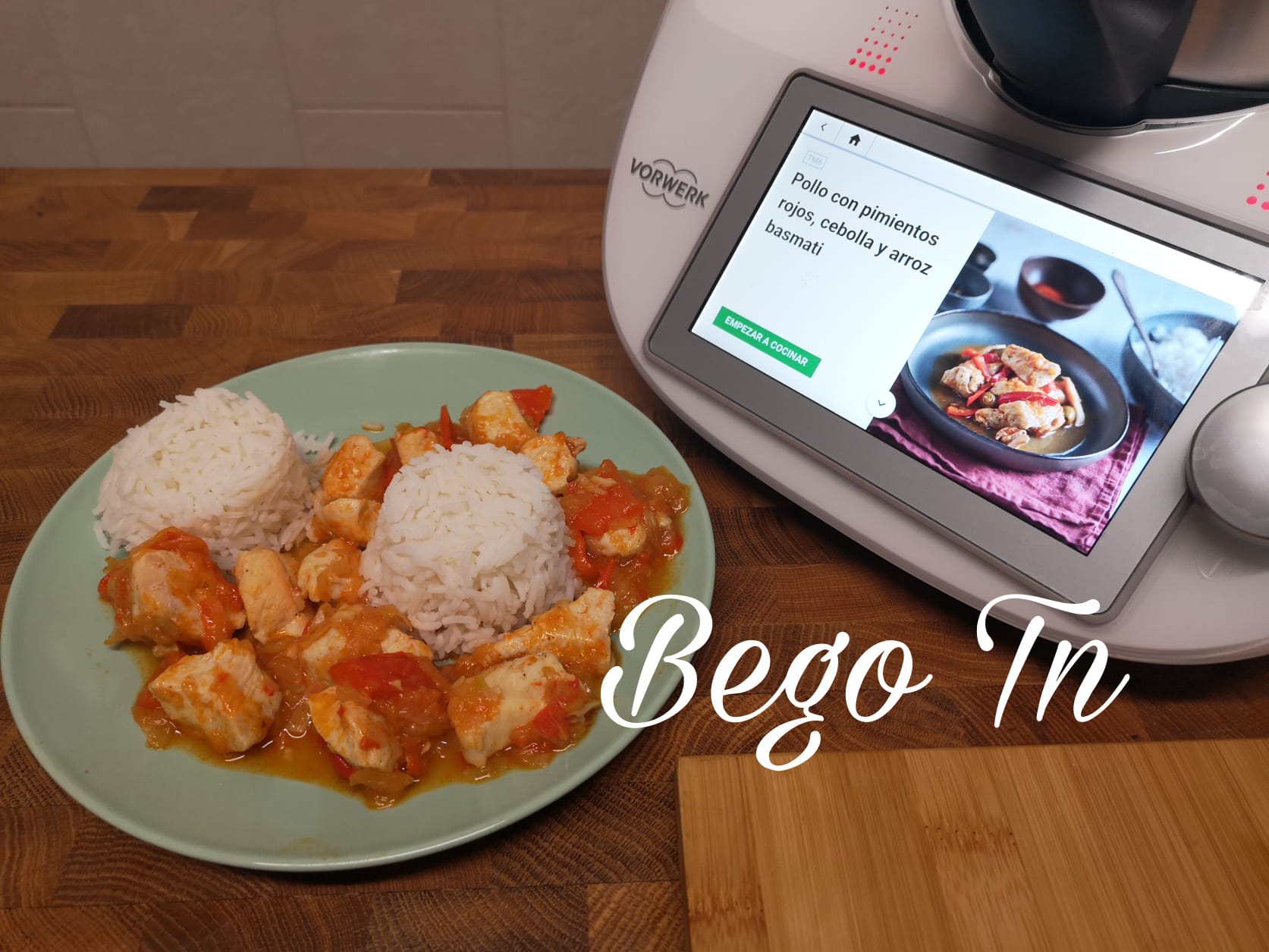 Pollo con pimientos rojos, cebolla y arroz basmati en Thermomix®