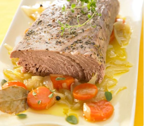 6. Desenvuelva el atún y póngalo en una fuente junto con la salsa, para que vaya cogiendo el sabor. Cuando se haya enfriado, corte el atún en rodajas finas y sírvalo con la salsa a temperatura ambiente o frío.