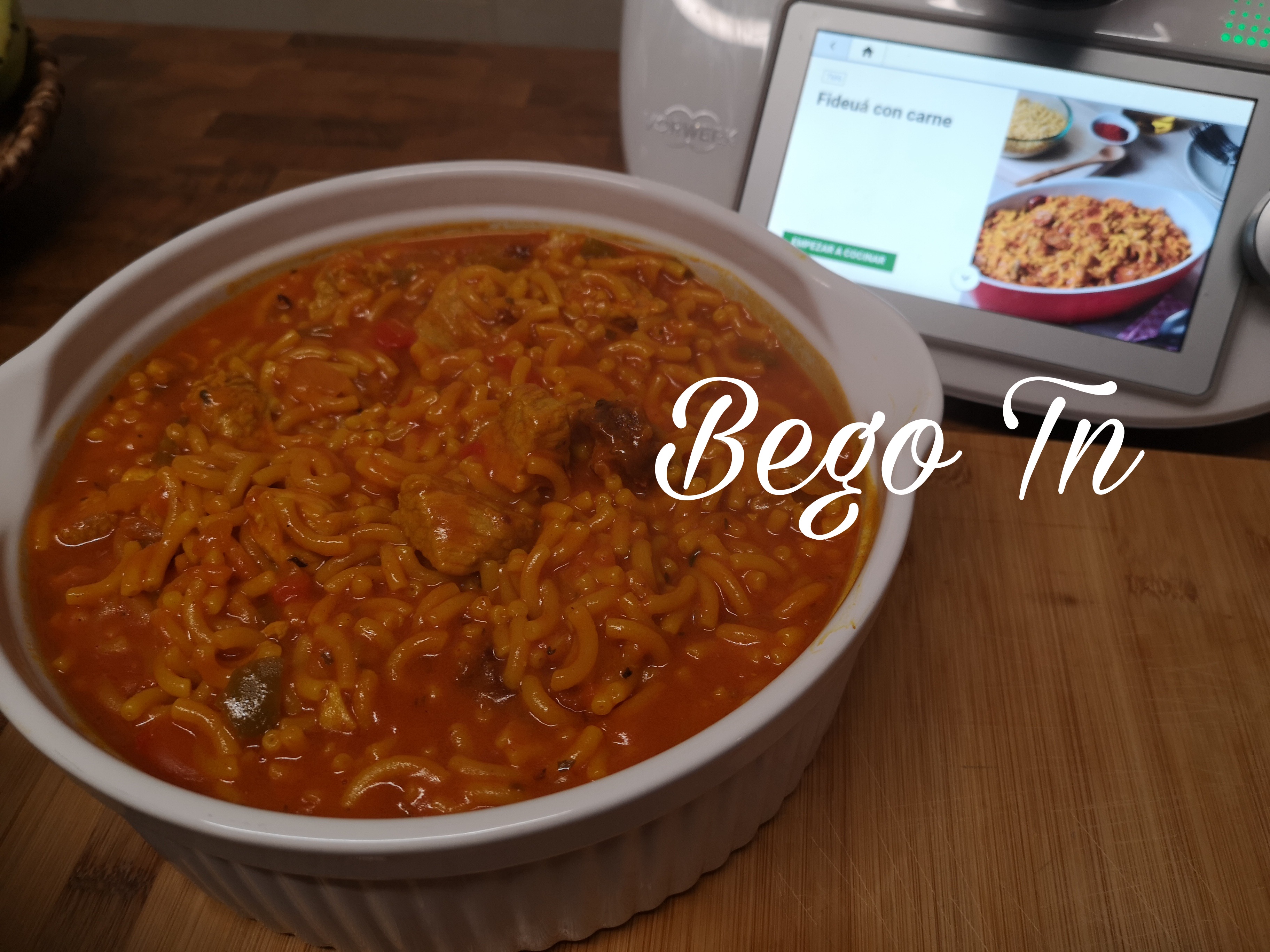 4. Añada los fideos y programe 8 min/100°C/giro inverso/vel 1. Vierta la fideuá en una fuente, deje reposar unos minutos y sirva.