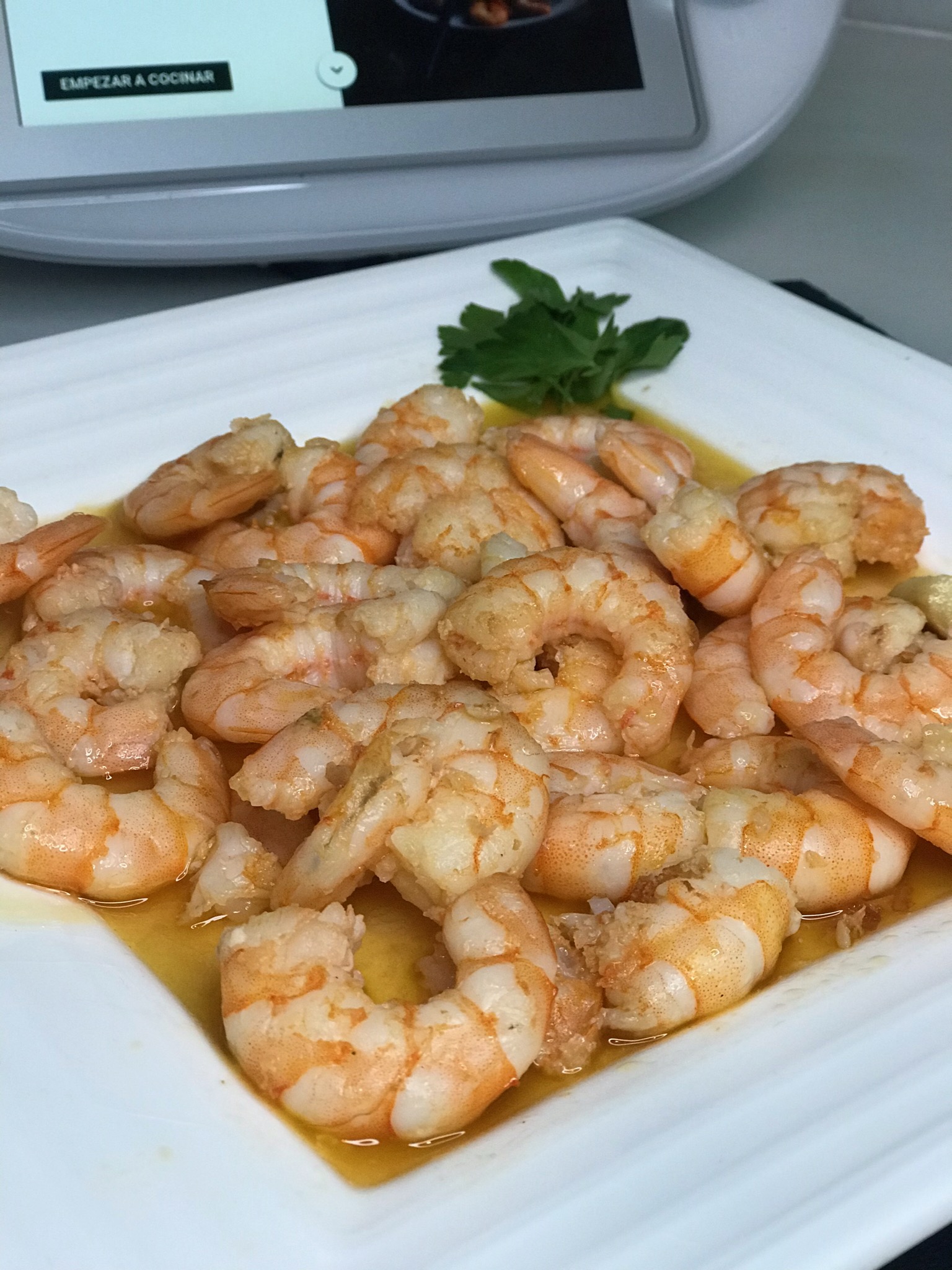 - Añada los langostinos y la guindilla (opcional) y nos asegúramos que los langostinos quedan bien distribuidos dentro del vaso e inicie Alta Temperatura y giramos el selector de velocidad. Sazone a gusto y sirva inmediatamente o utilice a su conveniencia.