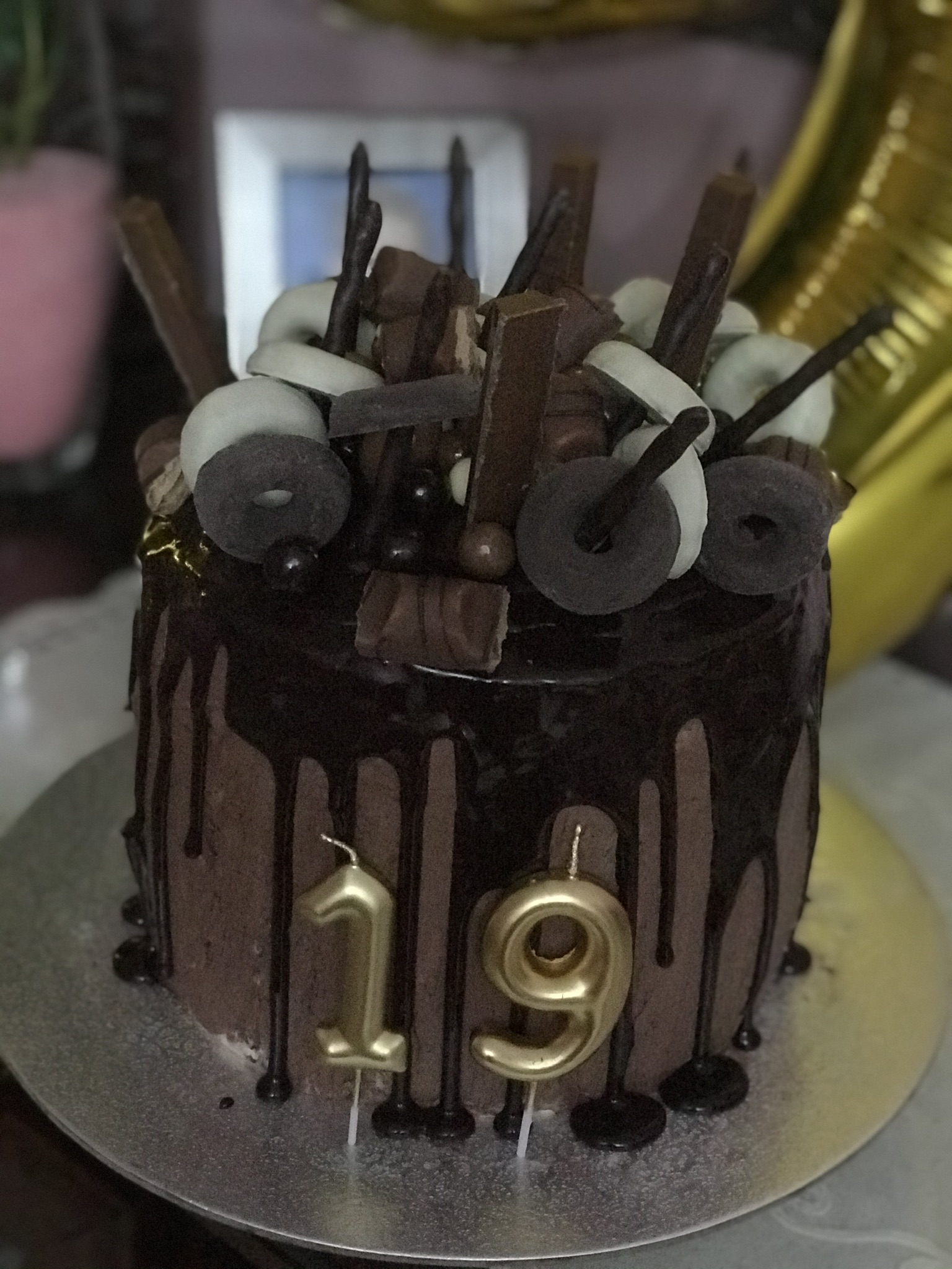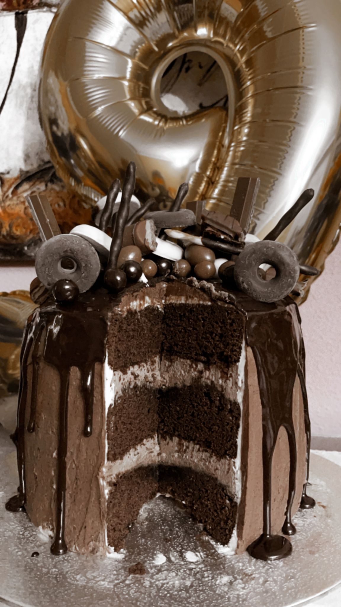 Antes de servir, decore la tarta a su gusto con bombones, barritas de chocolate, bolas de diferentes tamaños bañadas en diferentes chocolates, etc.