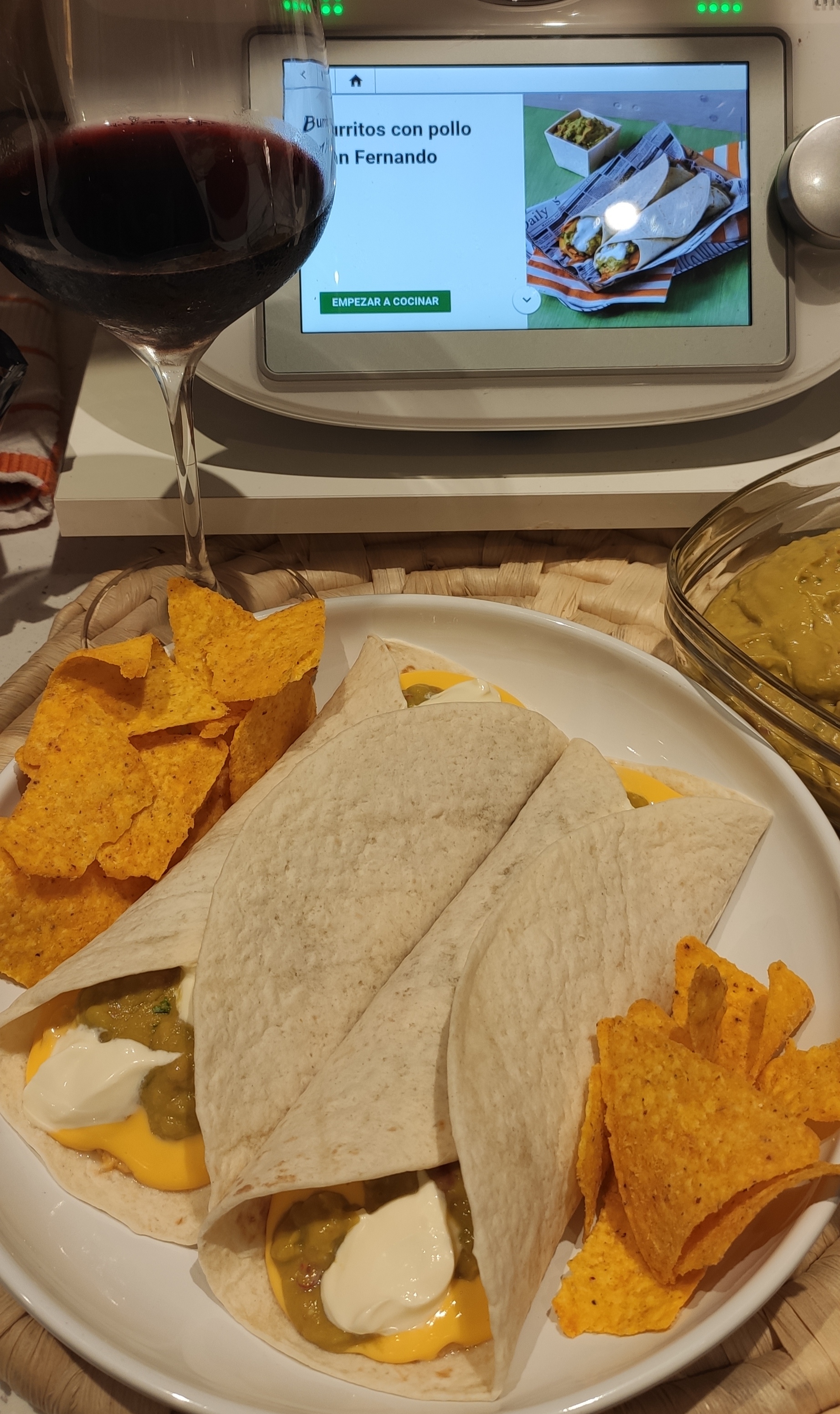 5. Calienta las tortillas de trigo para que estén flexibles (puede hacerlo en el microondas durante 1 minuto dentro del envase o una a una en la sartén). Distribuye sobre las tortillas el pollo, el queso fundido, el guacamole y 1 cucharadita de crème fraîche, que le da un sabor espectacular. Enrolla formando los burritos, sirve inmediatamente, y disfuta!!!
