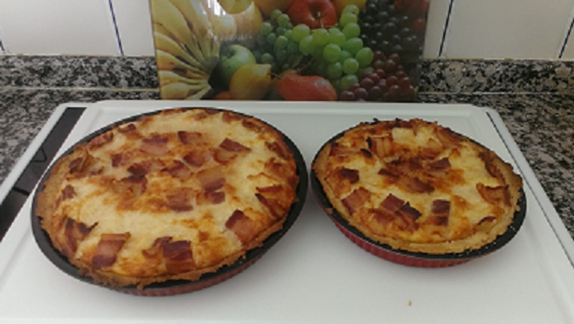 - Vierta el relleno sobre la tartaleta de masa quebrada, cubra con el queso rayado reservado y adorne con las tiras de beicon. Introduzca en el horno durante 15 minutos, si el paso 6 lo hemos suprimido el tiempo de horno sera mayor.