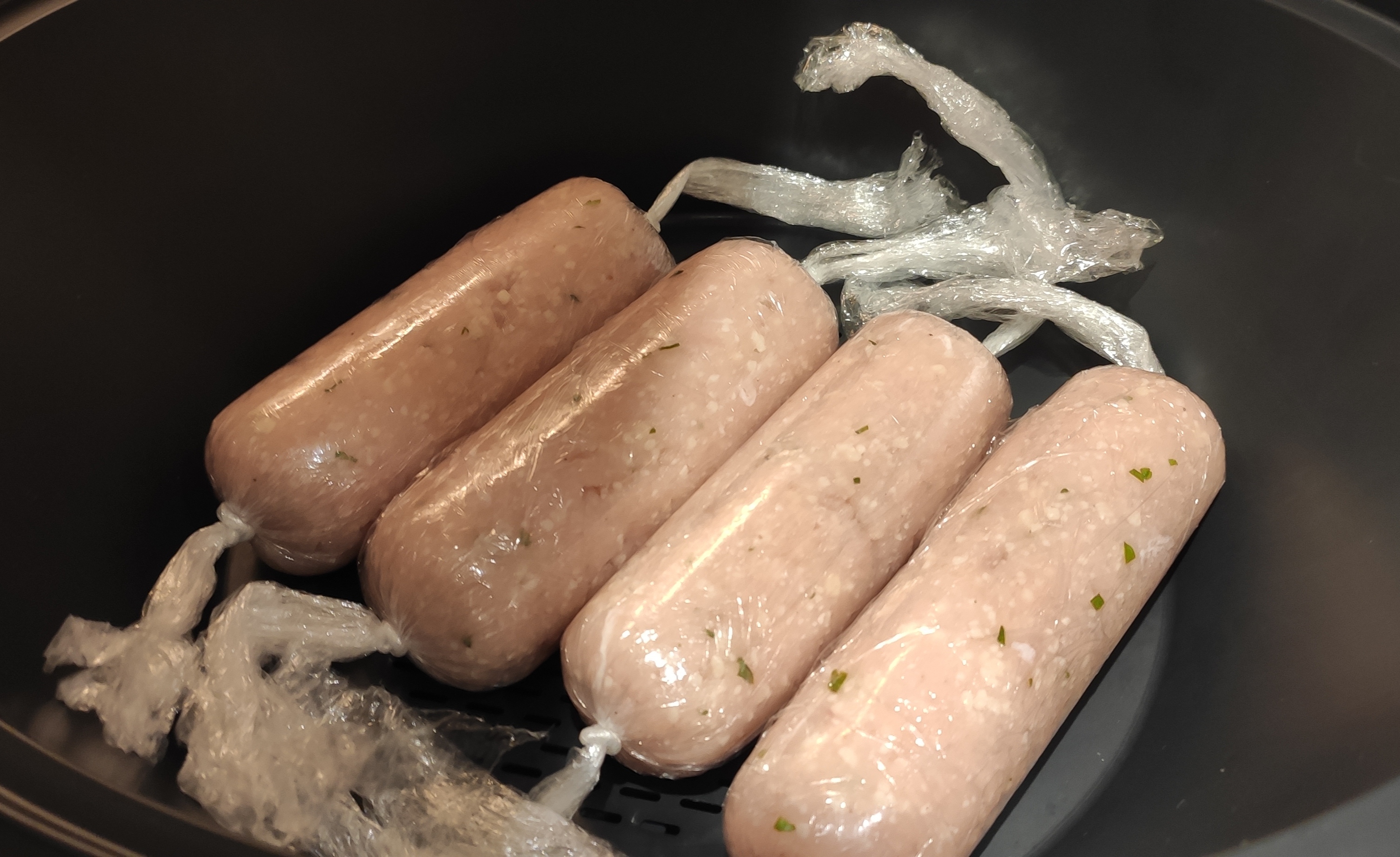 3. Ahora dividimos la mezcla en 4 partes y colocamos cada una sobre un rectángulo de film transparente, dándoles forma de salchicha alargada y gruesa. Las envolvemos procurando que queden bien selladas, deslizándolas por la encimera, formando un caramelo, como en la foto. Las colocamos en la bandeja Varoma y reservamos.