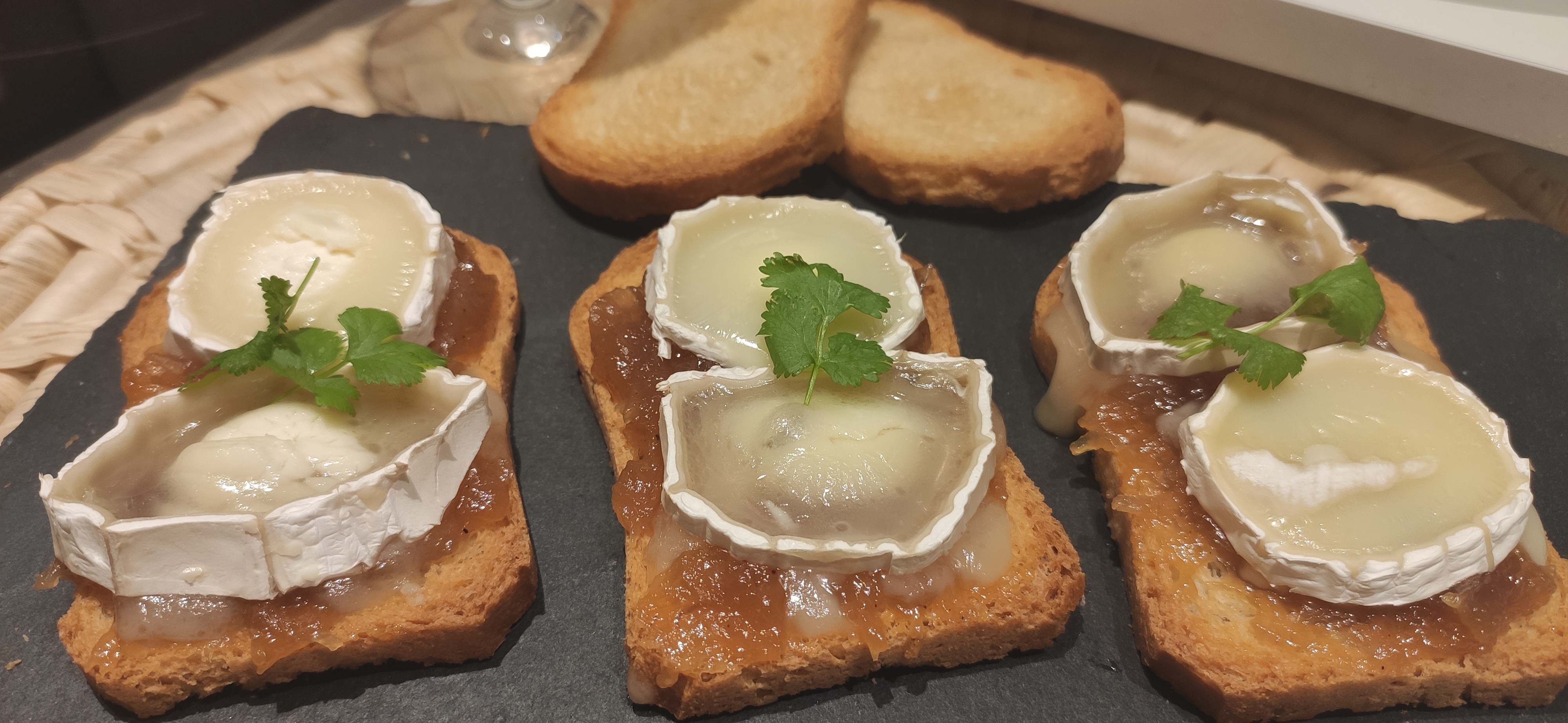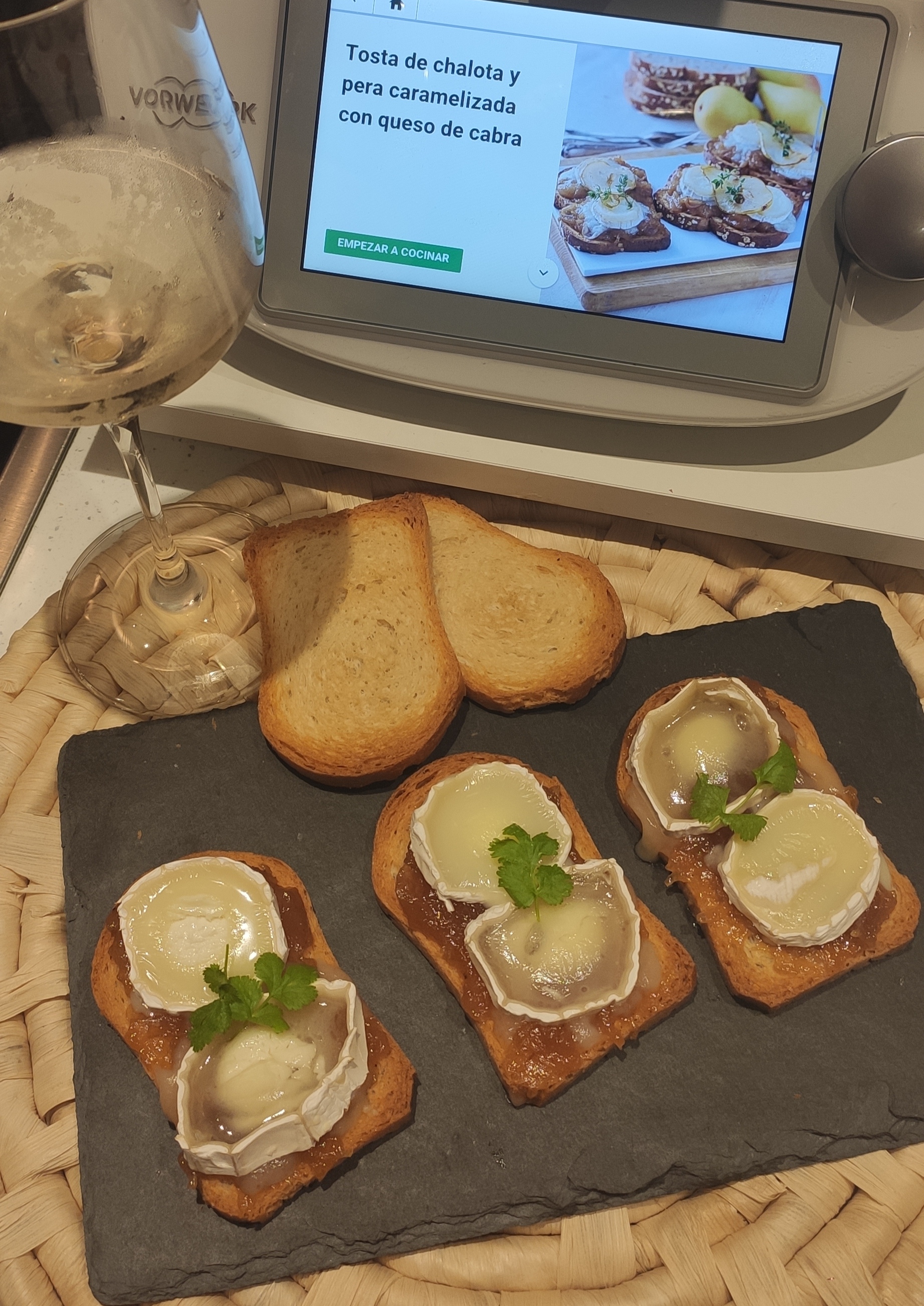 TOSTA DE CHALOTA Y PERA CARAMELIZADA CON QUESO DE CABRA