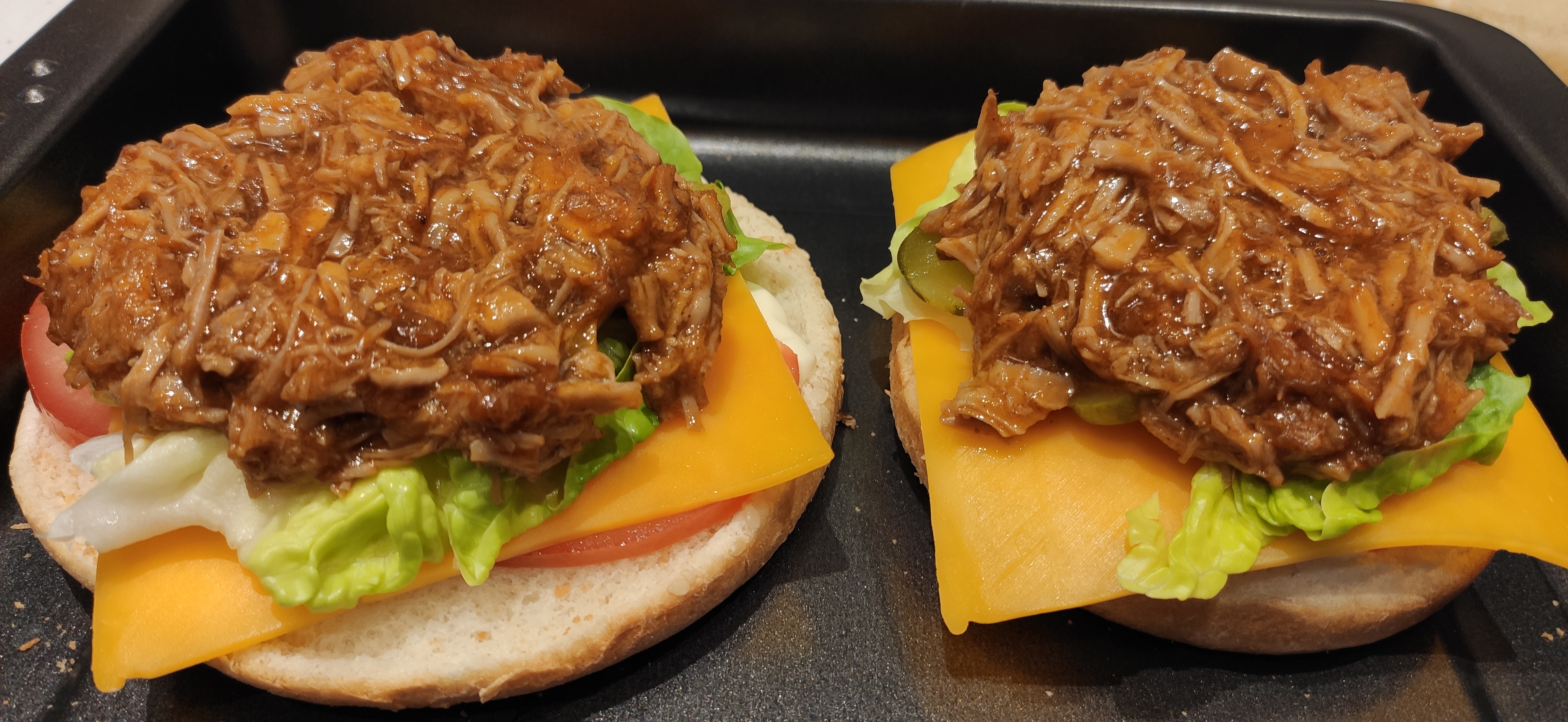 Sobre la mitad inferior de los panes, pon en este orden: el queso, la carne deshilachada, los pepinillos, la lechuga y la cebolla. Cubre con la otra mitad del pan y hornea durante 5 minutos (200°C) . Retira del horno y sírvelo inmediatamente.