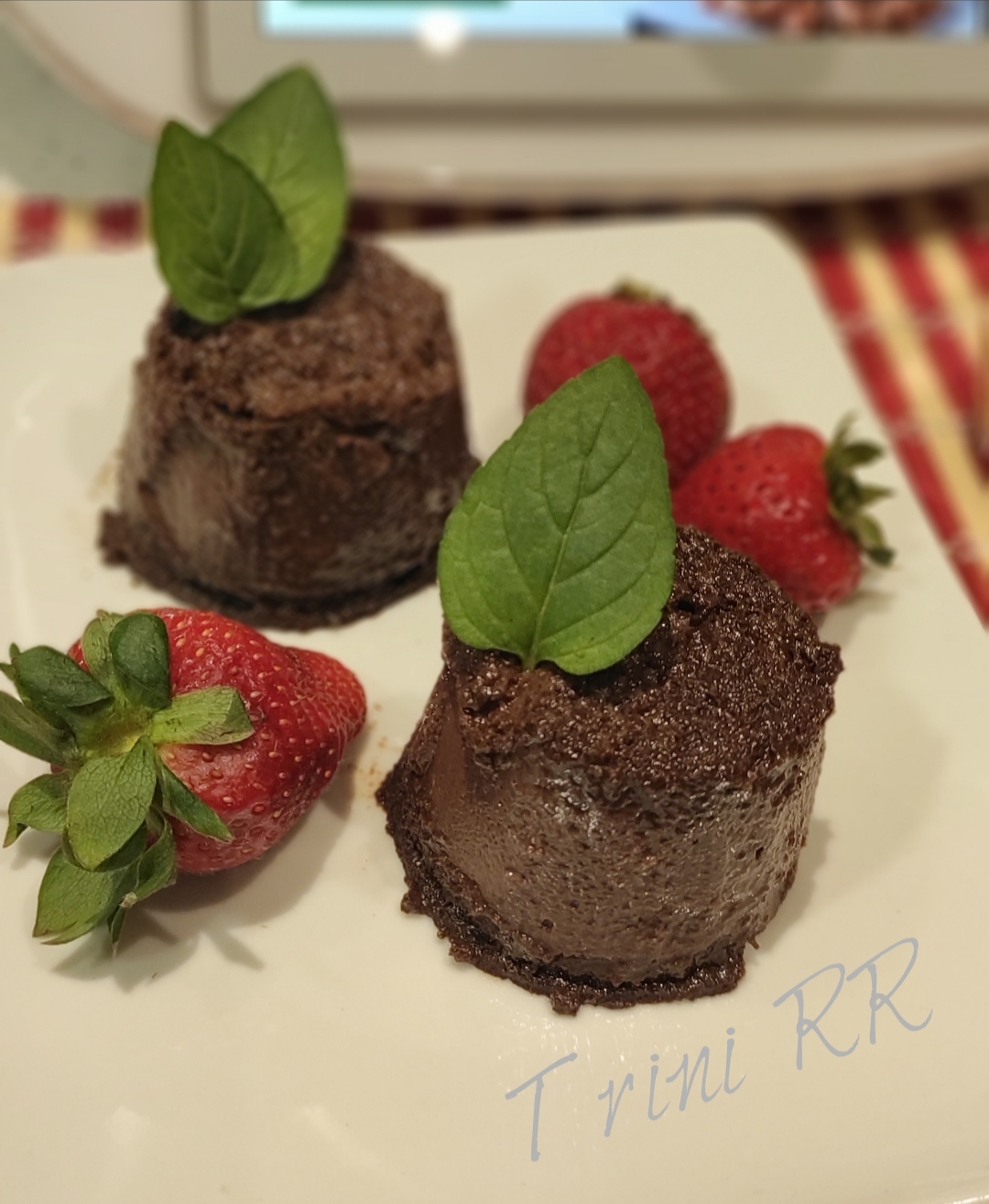7. Servimos el pollo con las patatas como plato principal y el pudin de chocolate como postre.