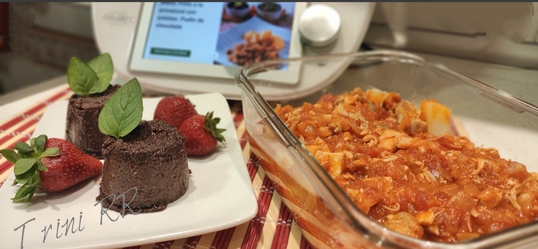 La receta se llama Menú de pollo a la provenzal con patatas y pudín de chocolate. La podéis encontrar en cookidoo en el enlace que os dejo a continuación.