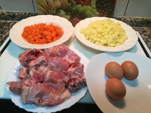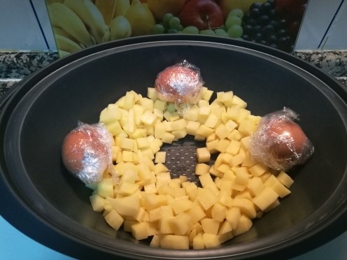 - Colocar los jamoncitos y contramuslos los de muslo de pollo con la piel, con el hueso hacia arriba, echar la cucharada de pimentón, cucharada de comino, cucharada de orégano, cucharada de tomillo, la sal y la media pastilla de caldo, el vino blanco y el agua, colocar la tapadera y colocar el varoma con las patatas y los huevos envuelto en film transparente y la bandeja varoma con la zanahorias, programar 35min./Varoma/giro inverso/velocidad cuchara.
