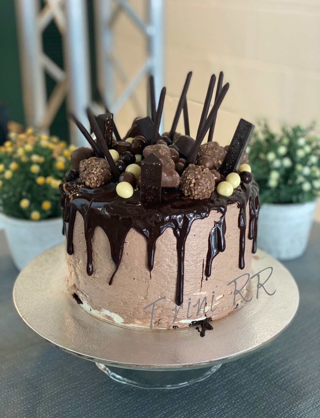 La tarta se llama "Tarta de goteo o chocolate dripping cake", debe su nombre a que iremos dejando caer una exquisita cobertura de chocolate que irá cayendo poco a poco por los bordes, consiguiendo ese espectacular resultado de goteo. Luego la adornaremos con toda clase de chocolatinas, barritas de chocolate, cereales tipo conguitos,......