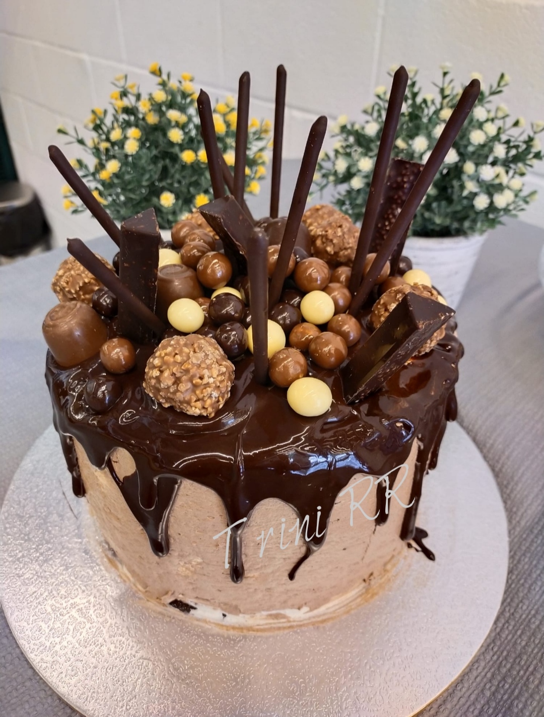 Antes de servir, decoramos la tarta a nuestro gusto con bombones de chocolate blanco, con leche y negro, barritas de chocolate, bolas de diferentes tamaños bañadas en diferentes chocolates, mikados, etc....