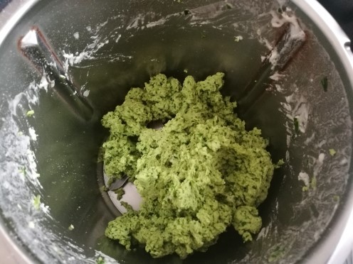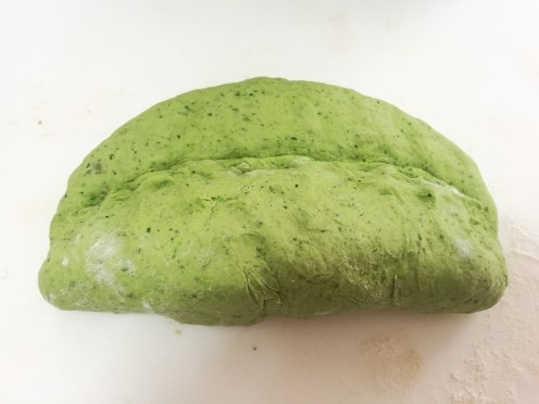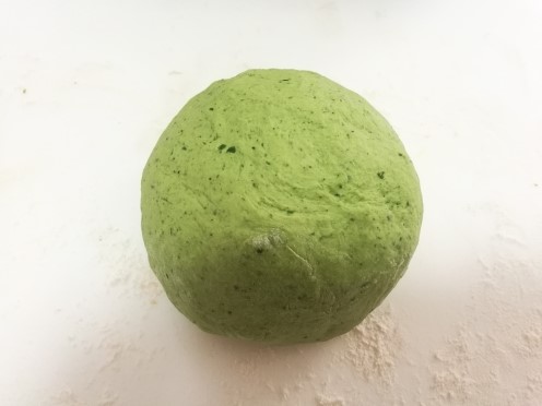2. Ponga en el vaso 180 gramos de agua, la levadura, las hojas de espinaca, la harina y la sal. Mezcle 15 seg/Vel 6 y amase 2 min 30 seg/amasado. Con las manos engrasadas, retire la masa del vaso sobre la encimera espolvoreada con harina. Aplaste la masa, esparza la mitad de las pipas de calabaza (10 gramos) y forme una bola.