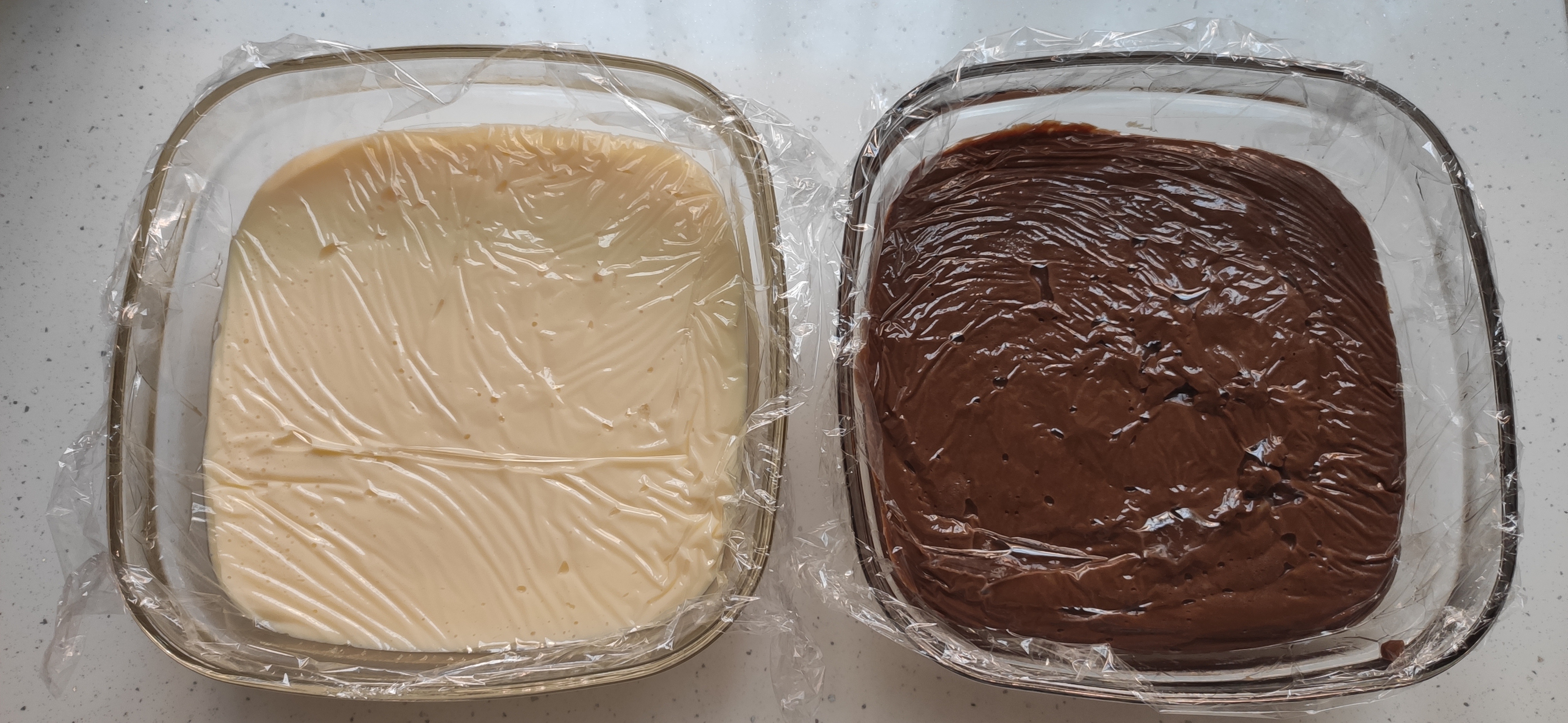 Para hacer esta tarta tenemos que preparar 2 tipos de crema pastelera, una de chocolate y otra normal.