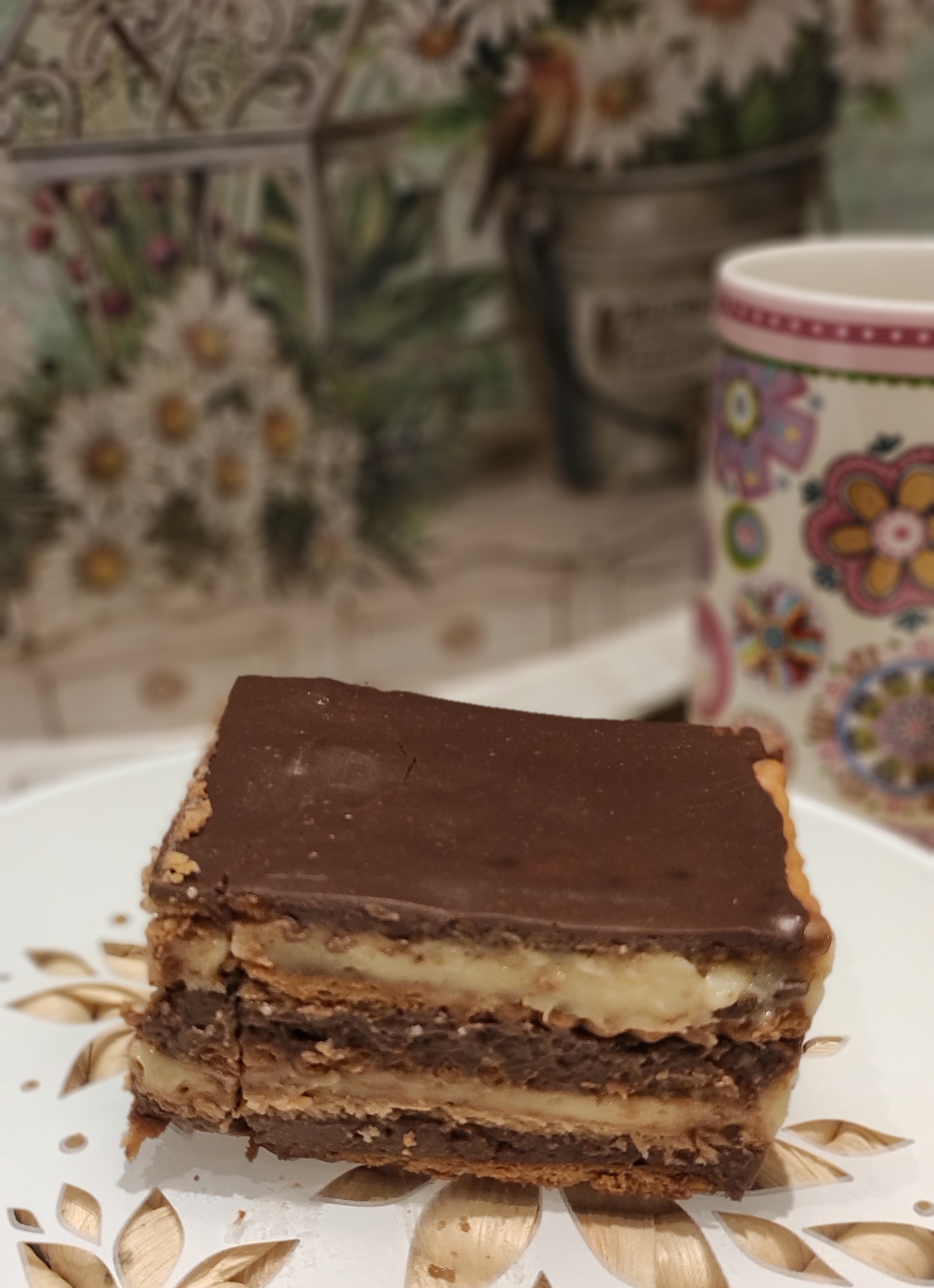 6. En un molde rectangular de unos 20 x 30 cm vamos a ir poniendo una primera tanda de galletas mojadas en la leche anteriormente calentada. Sobre esta tanda vamos a poner la crema pastelera de chocolate y la vamos a extender con la ayuda de una cuchara. Después ponemos otra tanda de galletas mojadas en la leche y a continuación una capa de la crema pastelera normal. Volvemos a poner otra tanda de galletas y repetimos los pasos hasta completar dos tantas de cada crema.