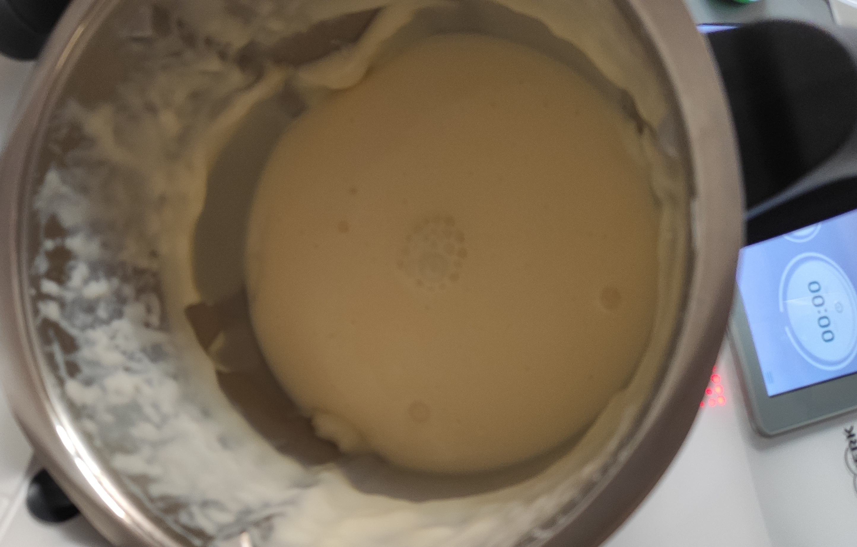 4. Ahora vamos a volver a hacer otra vez la crema pastelera, siguiendo los mismo pasos anteriores pero sin añadirle el chocolate, así que agregamos el azúcar, la leche, los huevos y la maicena y programamos 8 minutos, 90 grados y velocidad 5.