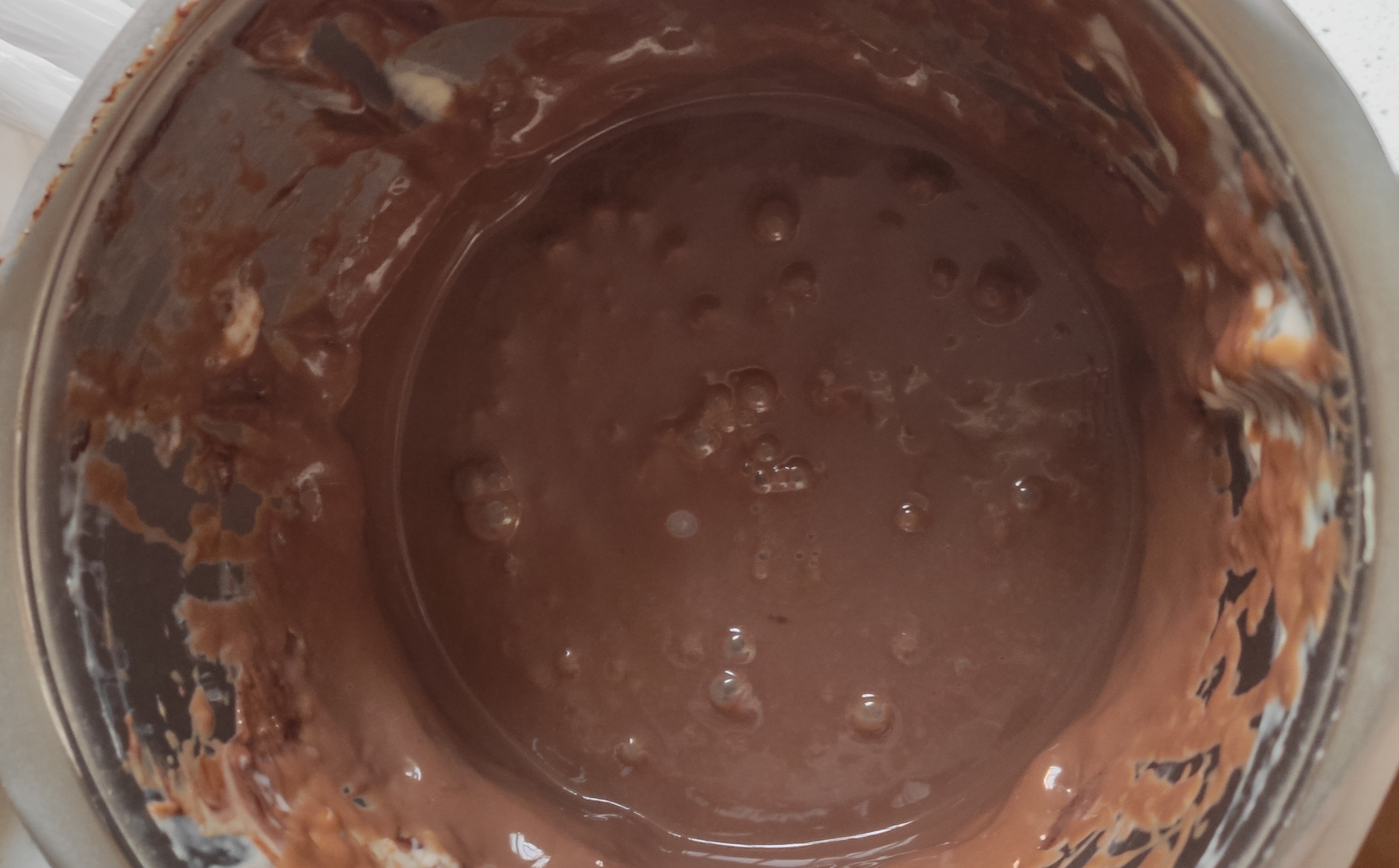 Agregamos la crema de chocolate a un bol y lo vamos a cubrir con papel film, poniéndolo en contacto con la crema para que no le entre aire y no se reseque. Lavamos el vaso.