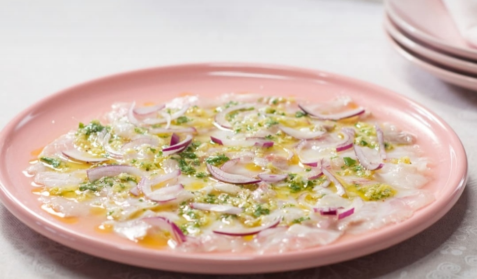 1. Retira la piel y espinas del filete de lubina y córtalo en láminas muy finas, con el cuchillo a 45º en relación a la superficie de trabajo. Coloca el pescado en una fuente para servir y riégalo con el zumo de lima.
