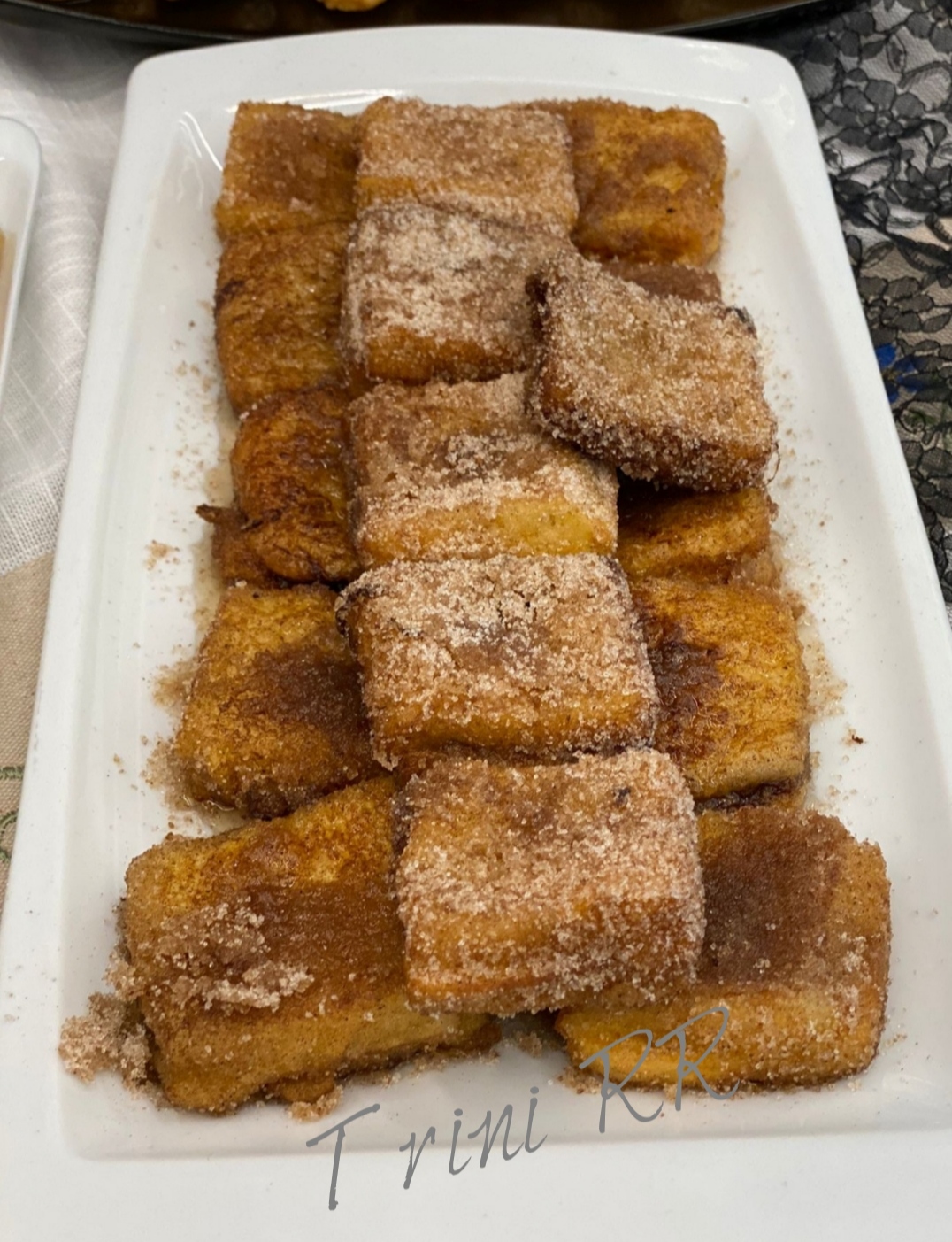 3. Calentamos el aceite en una sartén honda y bañamos cada minisándwich en la leche, y luego por el huevo batido y los freímos por tandas por ambos lados hasta que estén dorados. Retiramos sobre papel de cocina y los espolvoreamos con el azúcar y la canela. Es importante hacer este paso cuando aún esté caliente porque si no no se quedará pegada el azúcar.