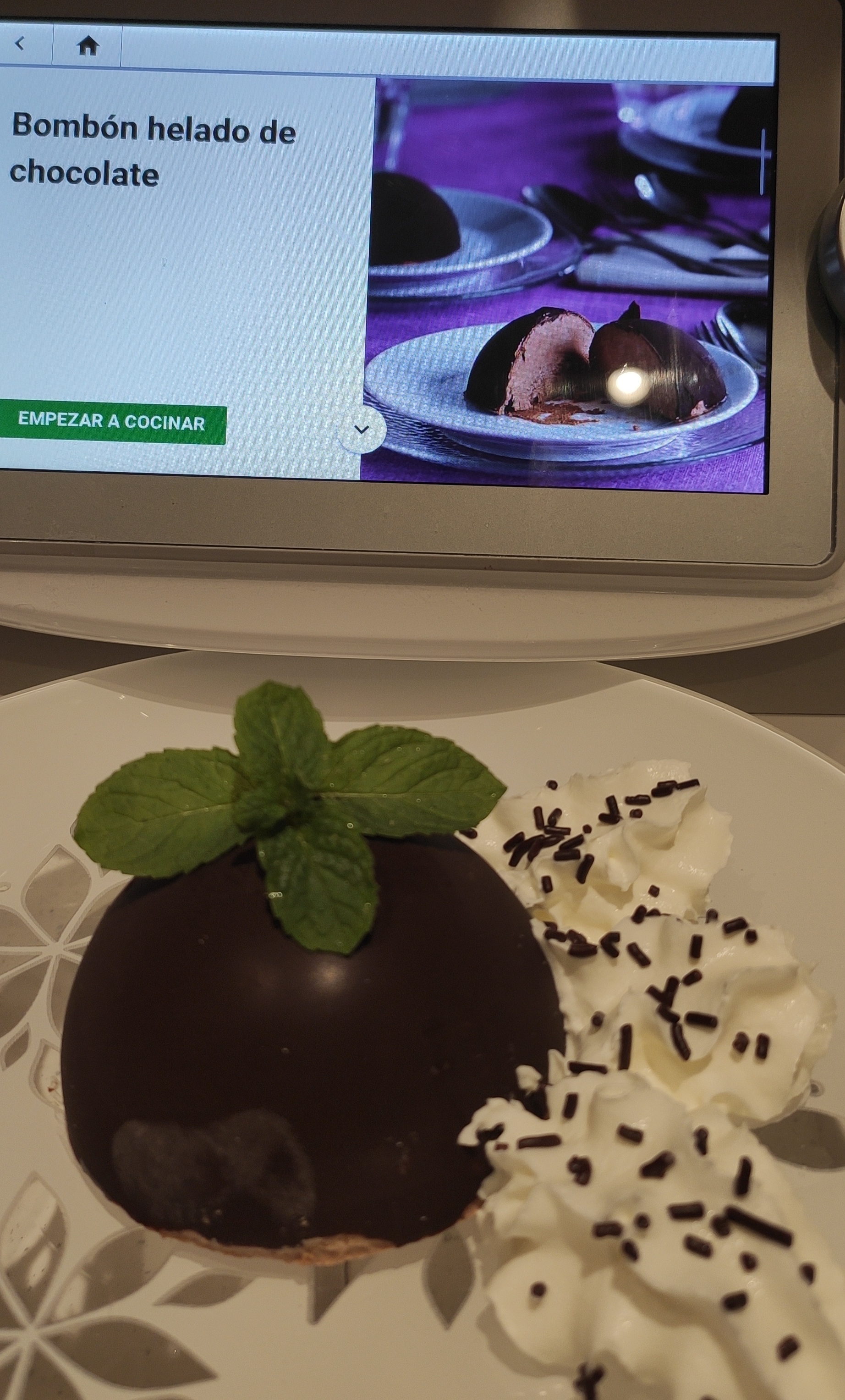 La receta se llama "Bombón helado de chocolate", es un postre sencillamente espectacular y que a lo mejor nunca nos hubiéramos atrevido a hacer, pero con la ayuda de nuestro Thermomix y de la cocina guiada que nos ofrece Cookidoo es todo muy fácil.