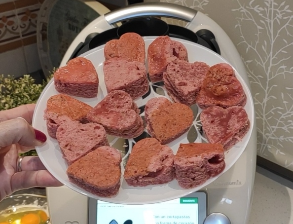 10. Cuando haya pasado el tiempo necesario, cortamos el bizcocho por la mitad transversalmente para obtener 2 discos iguales. Con la ayuda de un cortapastas con forma de corazón (no más grande que 4-5 cm), vamos a cortar corazones de las 2 mitades de bizcocho y los reservamos.