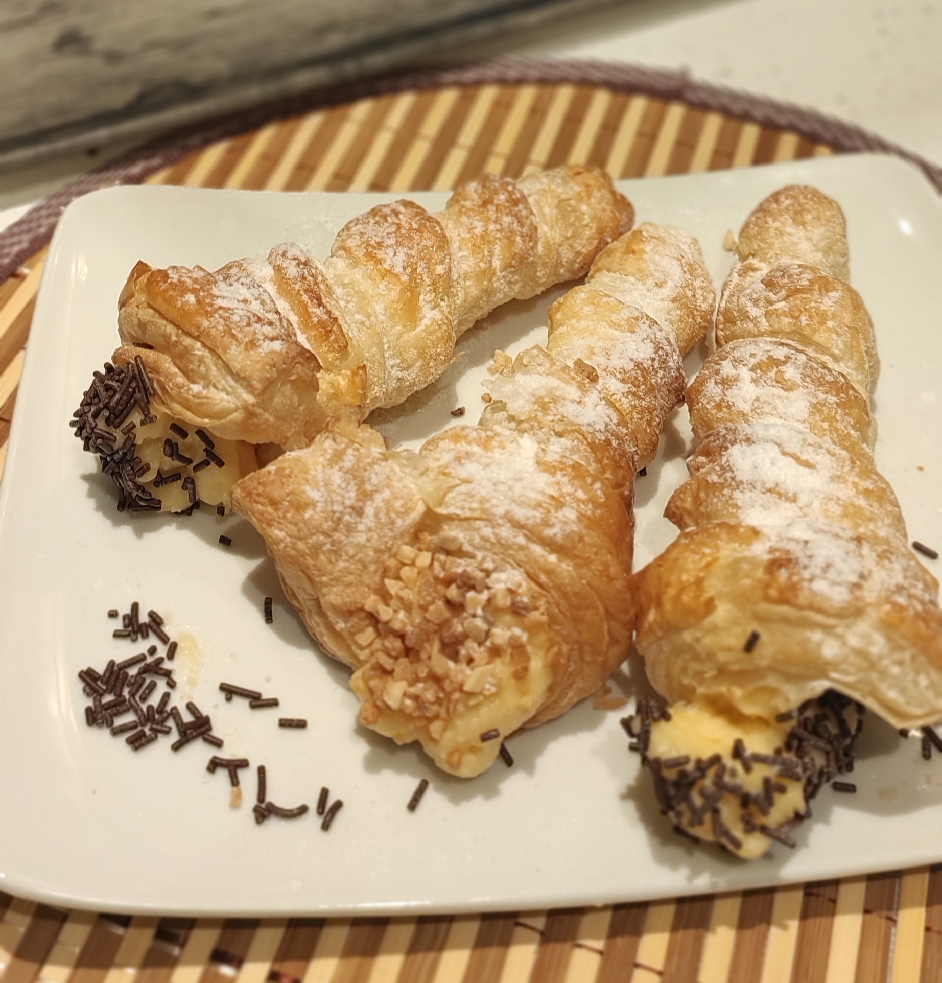 Son muy fáciles de preparar, os van a hacer falta unos conos de acero inoxidable para enrollar el hojaldre o podéis hacerlo también formando unos conos con papel de aluminio. Lo único que os va a llevar más tiempo es el dejar enfriar la crema pastelera para poder rellenarlos, el resto lo vamos a hacer en un periquete.