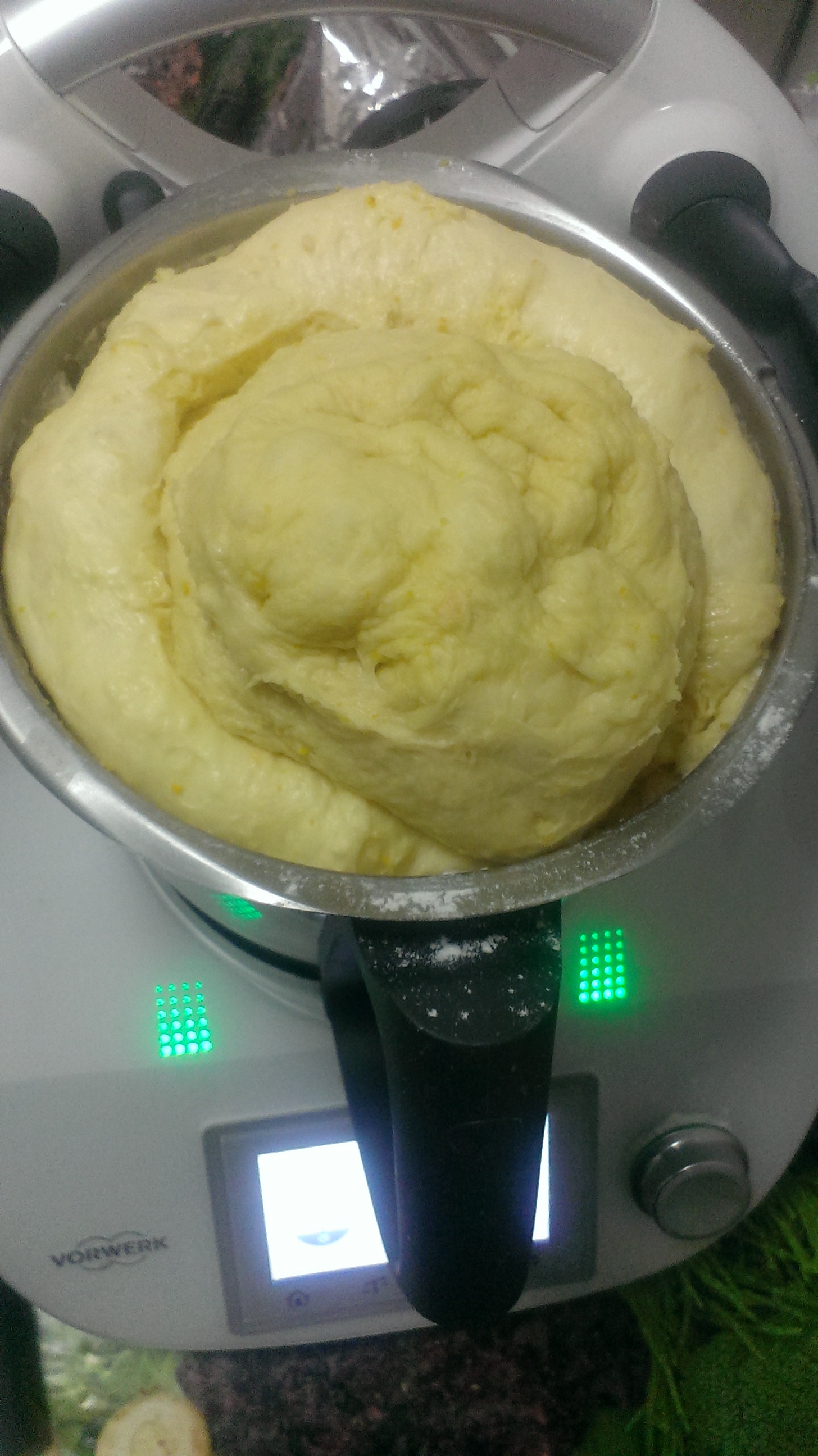- Añada la leche, la mantequilla, los huevos, la levadura prensada, el agua de azahar, la harina de fuerza, la sal y la bola de masa madre. Mezcle 30 seg/ vel. 6 y a continuación, amase 3 min/vaso cerrado/ velocidad espiga (la masa se moverá formando bola). Sin desmontar el vaso de la maquina y sin quitar el cubilete, cubra el vaso y la máquina con dos paños o una bolsa isotérmica para congelados. Déjelo reposar hasta que la masa salga por el bocal (aprox. 1 hora, en función de la temperatura ambiente).