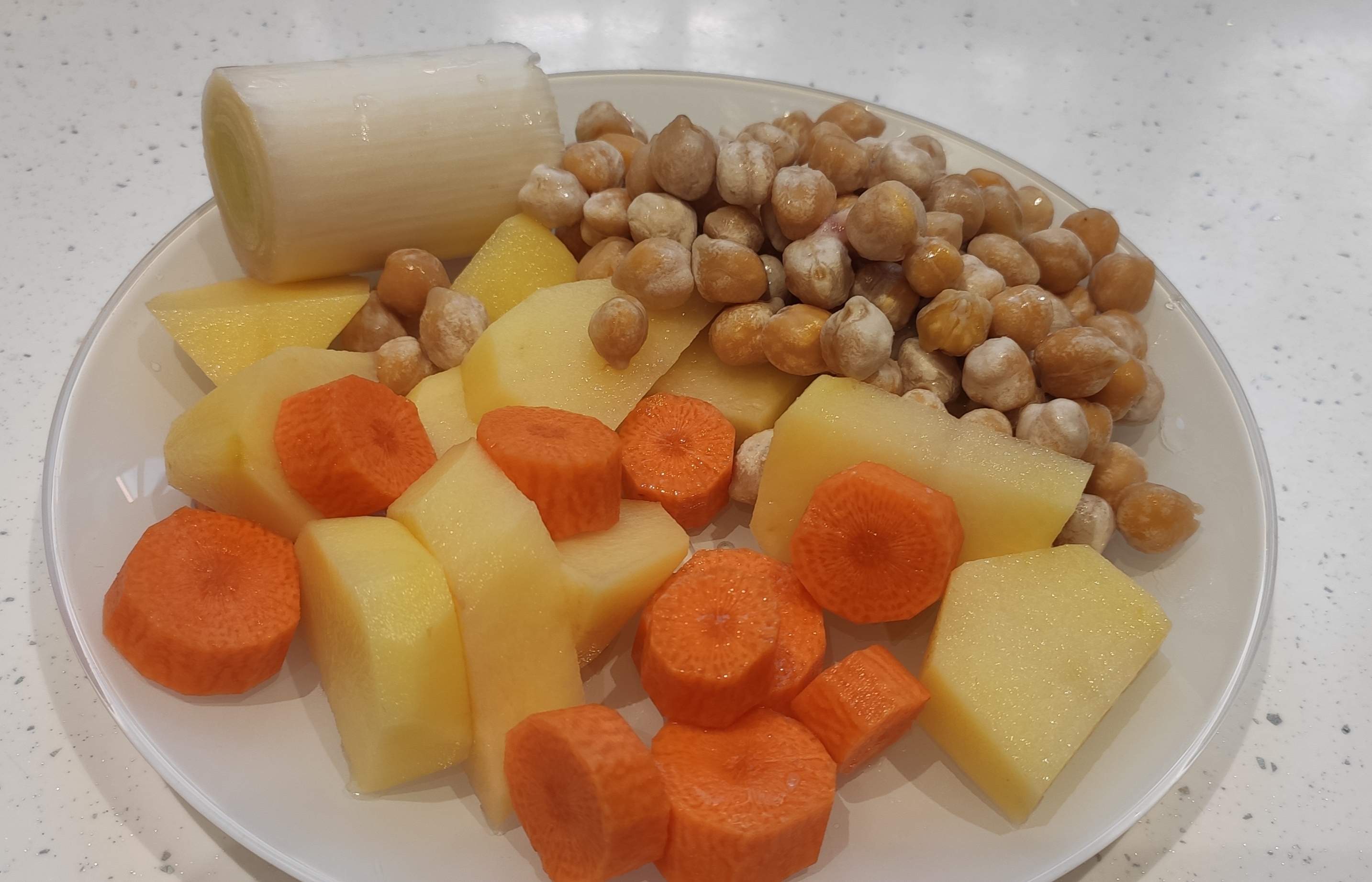 Vamos a hacer caldo de puchero de pollo, y a la vez coceremos patatas y zanahorias en el varoma para hacer una ensaladilla. Además con el pollo de haber hecho el caldo también también haremos una masa de croquetas, obteniéndo así tres comidas a la vez!!