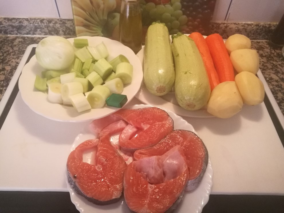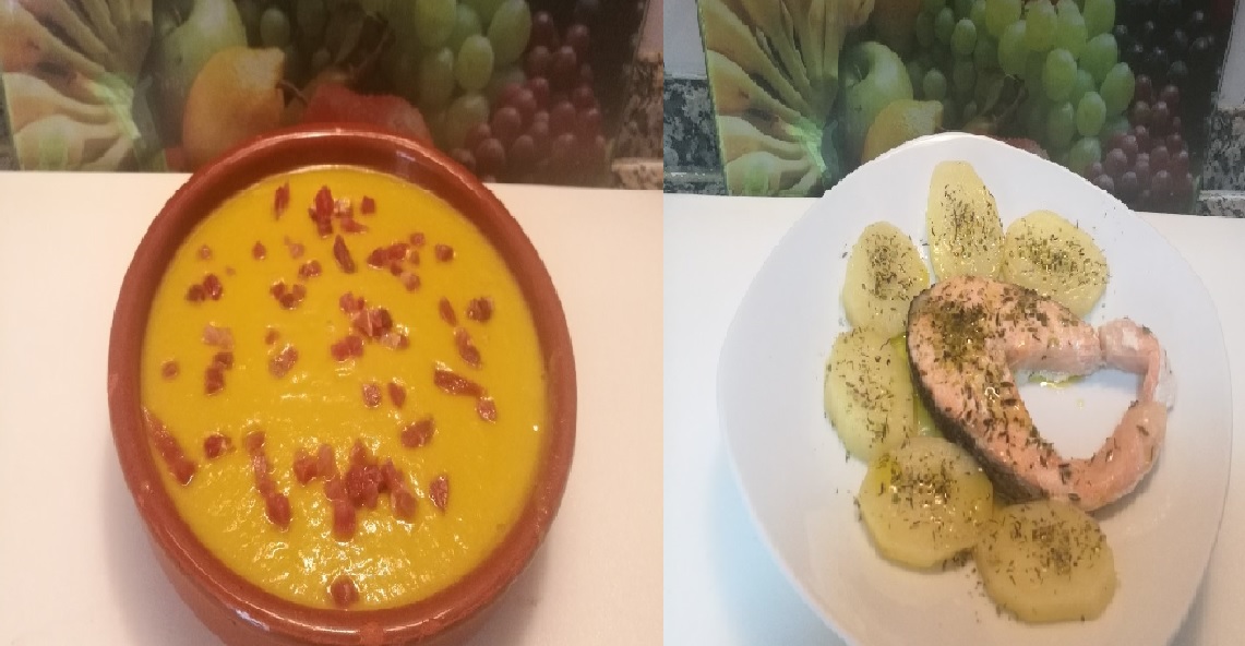 CREMA DE VERDURAS Y SALMÓN CON PATATAS AL VAPOR