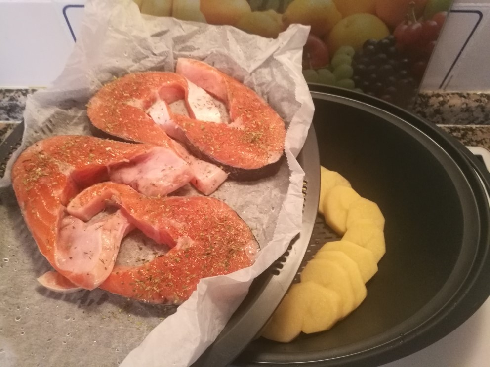 - Preparamos las patatas a rodajas de 1cm y la colocamos en el Varoma, colocamos un papel de hornear en la bandeja Varoma y colocamos el salmón, espolvoree la sal, oregano y tomillo, ponemos encima del Varoma y tapamos con la tapa varoma, quitamos el cubilete a la tapadera e incorporamos el Varoma, cuando queden 25 minutos.