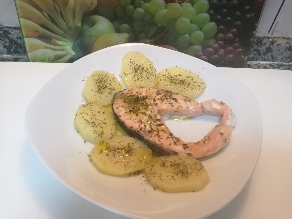 - Retiramos la tapadera Varoma y servimos el salmón con las patatas a rodajas al vapor, espolvoree a las patatas la sal, oréganos, tomillo y unas gotas de aceite, queda el segundo plato completado.