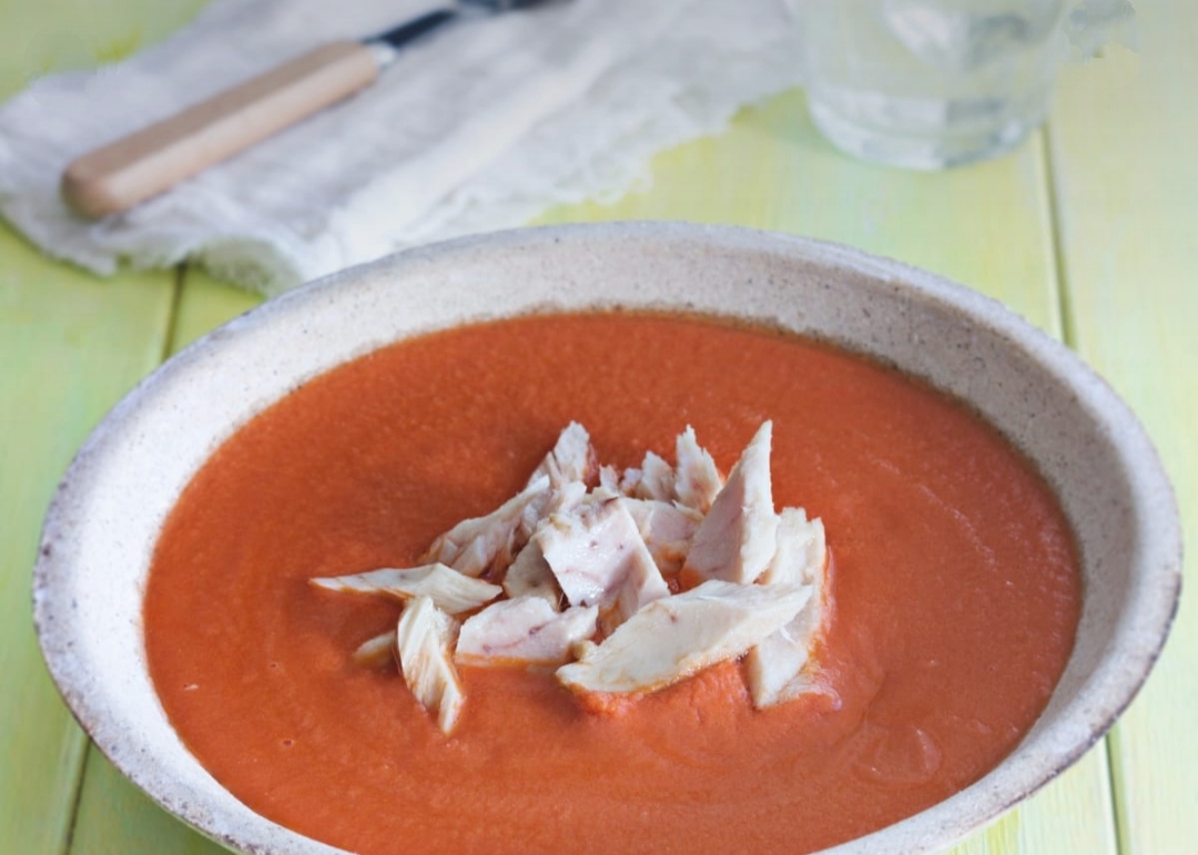 Servimos el salmorejo bien frío con el atún restante desmenuzado.