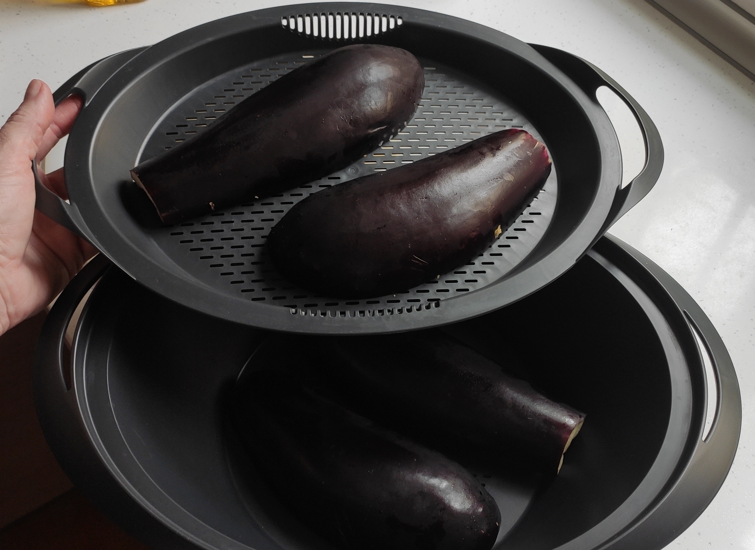 1. Primero cortamos las berenjenas por la mitad longitudinalmente y las vaciamos con cuidado de no cortar o romper la piel. Reservamos la pulpa extraída. Ponemos las berenjenas en el recipiente Varoma espolvoreadas con 1 cucharadita de sal y con la piel hacia arriba. Tapamos y reservamos el Varoma.