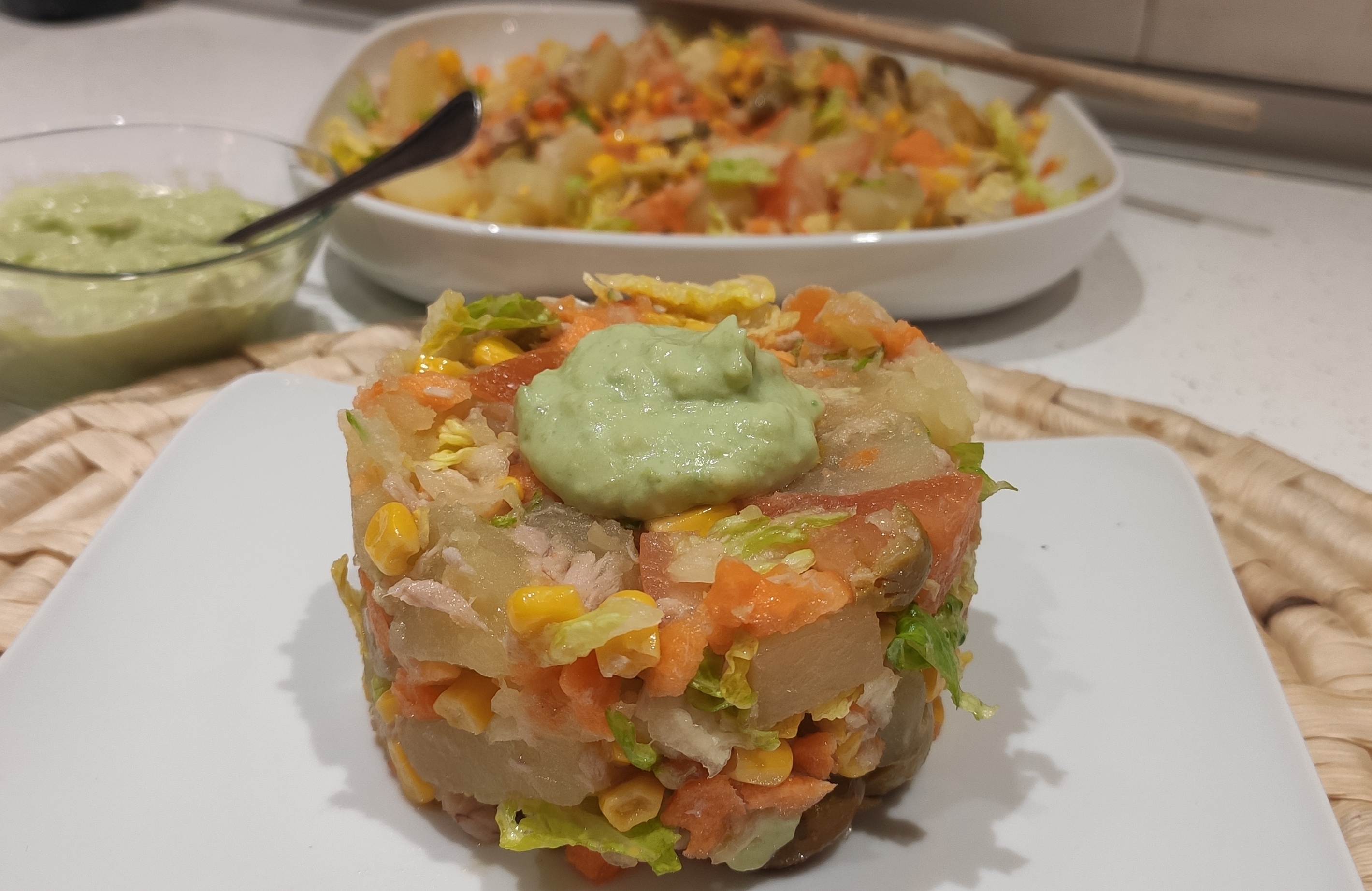 Servimos la ensaladilla a temperatura ambiente acompañada con la salsa de aguacate.